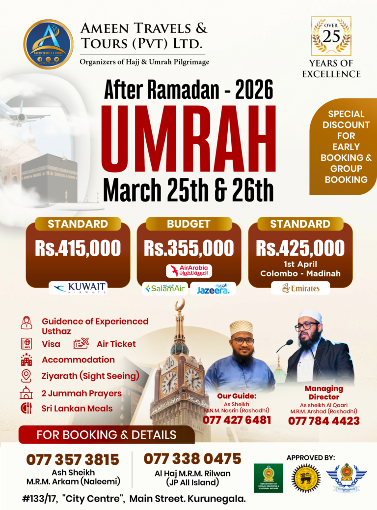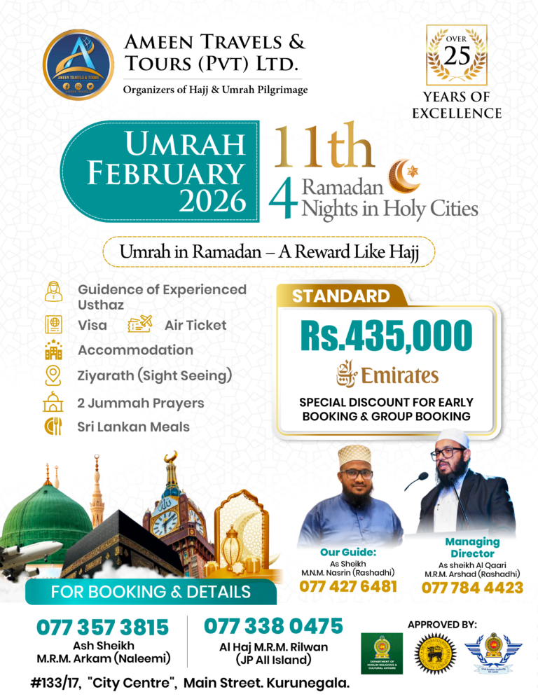 Welcome to Ameen Travels and Tours Pvt. Limited is your trusted partner in Hajj, Umrah, and travel services, proudly serving the community since 1998. Based in the vibrant city of Kurunegala, Sri Lanka, we are a government-registered organization committed to delivering exceptional travel experiences. As we celebrate 25 years of excellence, we remain dedicated to ensuring your journey—whether spiritual or recreational—is seamless, comfortable, and unforgettable.